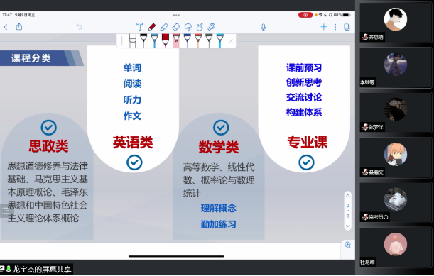 龙宇杰学长首先为同学们讲述了他的学习经验。他将自己的学习生活分成了思政类、英语类、数学类以及专业类四个部分介绍,建议同学们应该做到课前预习,课后总结,将每节课的知识充分吸收。