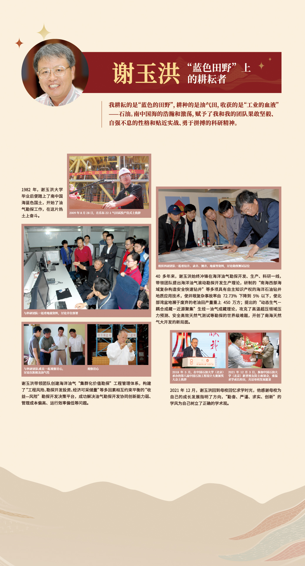 【心语】我是“耕田人”。不同的是,我耕耘的是“蓝色的田野”耕种的是油气田,收获的是“工业的血液”石油。南中国海的浩潮和激荡,赋予了我和我的团队果敢坚毅、自强不息的性格和贴近实战、勇于拼搏的科研精神。