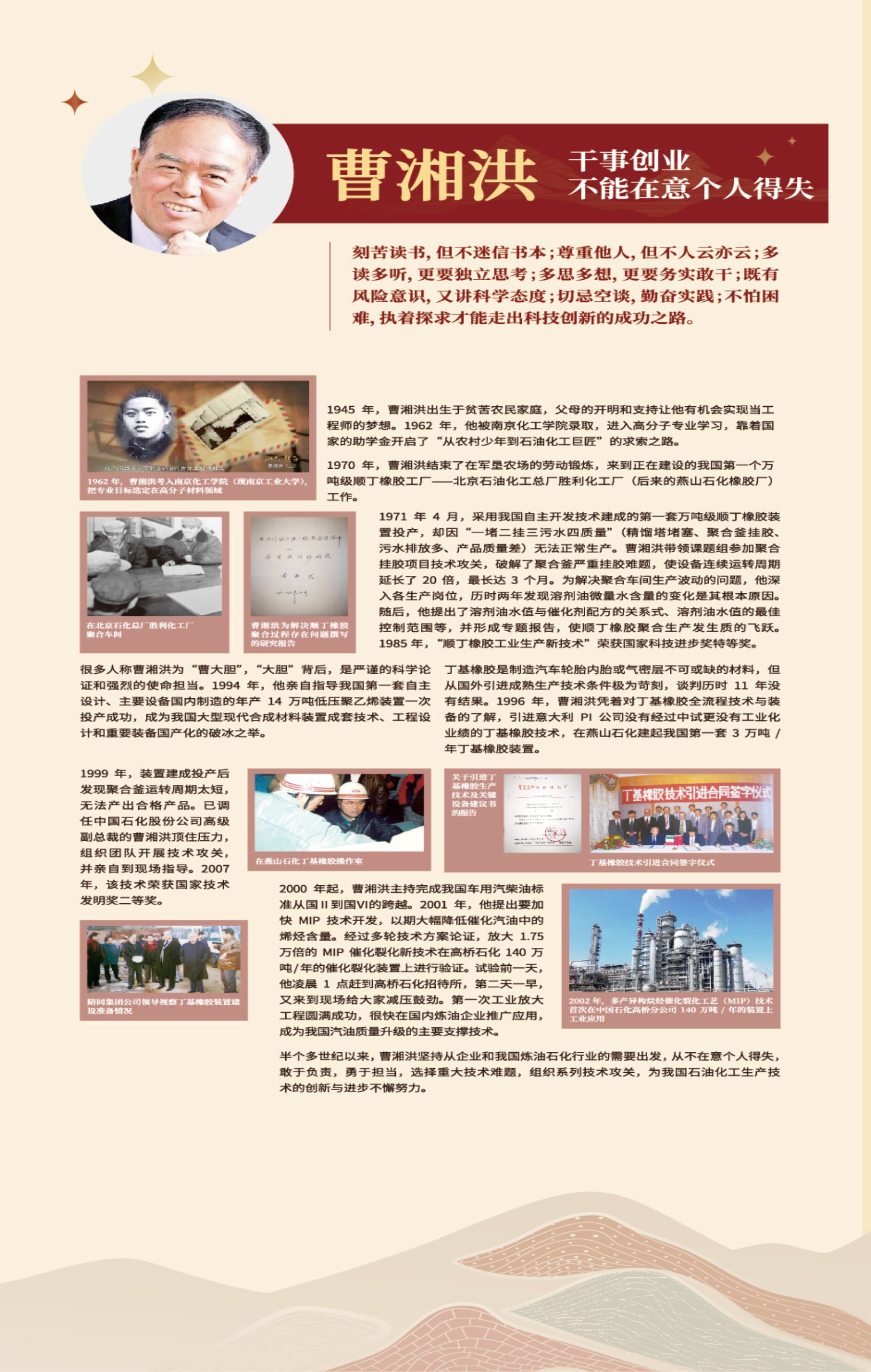 1967 年毕业于南京化工学院。现任中国石化集团有限公司科技委资深委员,全国石油产品和润滑剂标准化技术委员会主任,国务院安委会危化品安全专委会专家组组长。曾任北京燕山石油化工公司橡胶厂副厂长,燕山石化公司总经理、董事长,中国石化股份公司董事及高级副总裁、中国石化集团公司总工程师及科技委主任等职。受聘担任中国石油大学(北京)化学工程与环境学院名誉院长、重质油国家重点实验室第六届学术委员会主任。