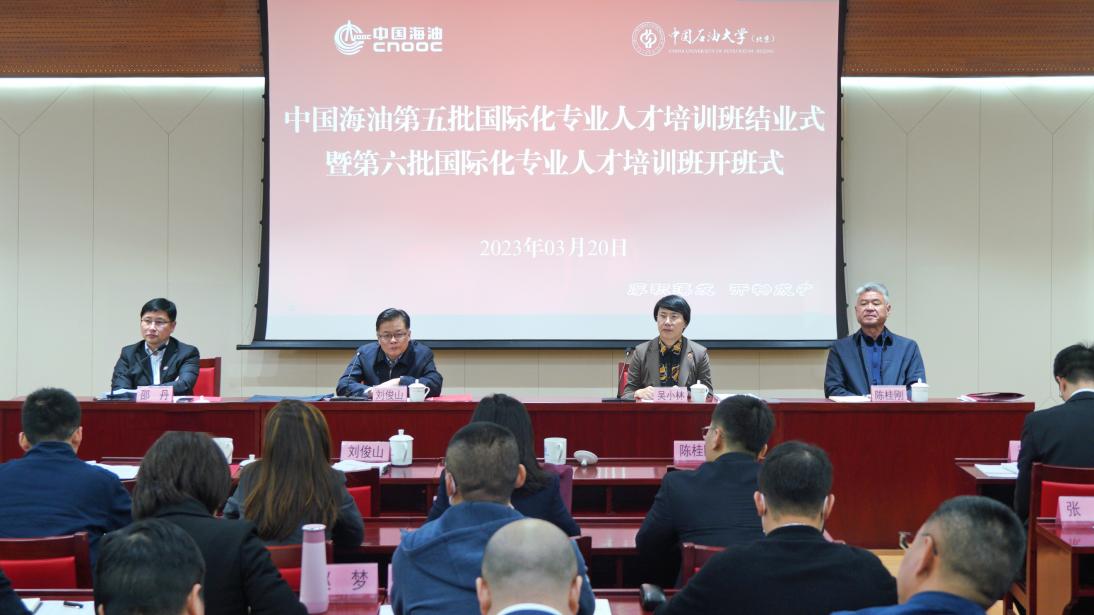 3月20日,由中国石油大学(北京)网络与继续教育学院承办的中国海油第五批国际化专业人才培训班圆满收官,第六批国际化专业人才培训班隆重开班。中国海油党组组织部部长兼人力资源部总经理刘俊山、中国石油大学(北京)校长吴小林、中国海油人力资源部人才开发处处长胡航、海油国际人力资源部副总经理谢金秋、网络与继续教育学院院长陈桂刚等参加结业及开班式,海油国际副总裁兼党委副书记邵丹主持结业及开班式。