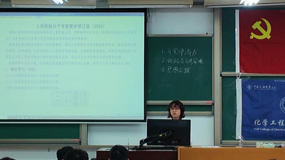 为进一步规范党员发展程序,切实提高新发展党员质量,加强对入党积极分子的系统培养与教育引导,10月23日下午,化工学院全体本科党支部于三教315联合组织开展2025年入党积极分子基础培训。本次培训聚焦思想淬炼、入党流程、文书规范与管理培养四大核心模块,旨在引导学员端正入党动机、夯实思想根基、明晰入党路径、践行实践要求。