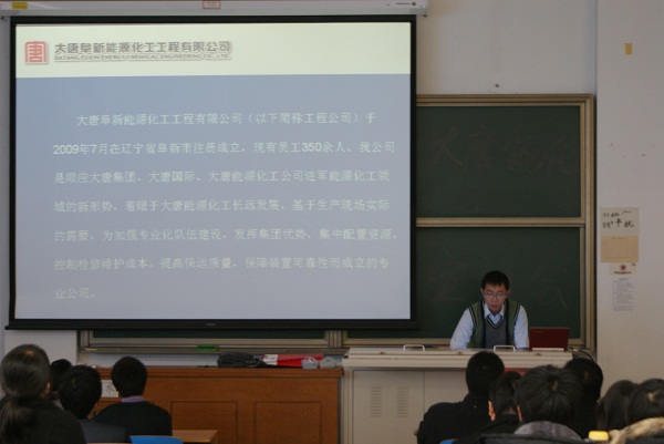 12月8日上午,大唐能源化工有限责任公司招聘宣讲会在中国石油大学新综合楼举行,大唐能源化工有限责任公司人力资源部主管夏利先生一行8人来我校宣讲招聘。