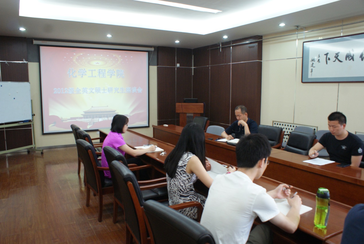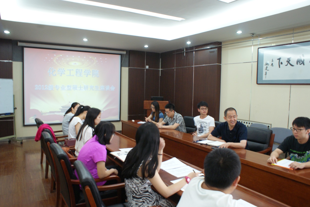 2015年6月11日上午,化工学院2012级全英文硕士班、专业型硕士座谈会在科学馆B座403召开,学院党委书记郭绪强、党委副书记胡建茹参加了本次座谈会。
