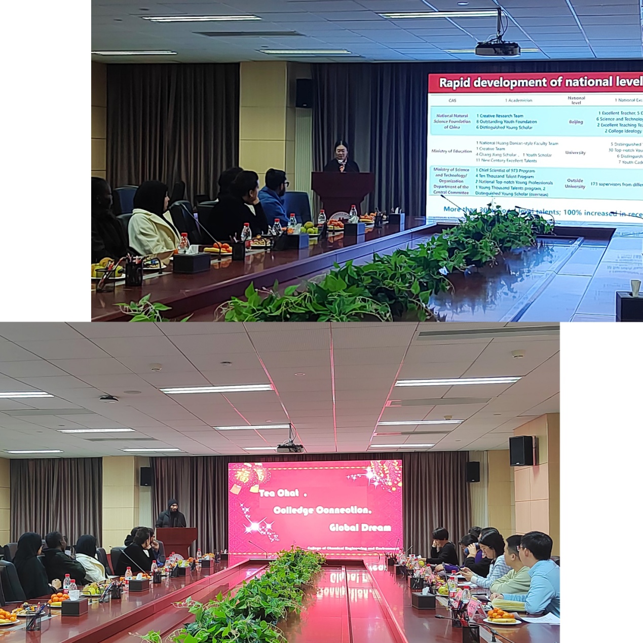 本次活动由化工学院商辉教授主持。商教授热情介绍了活动背景和参会的9名教师和10名留学生。院长张香平教授首先致辞并详细介绍了学院的发展历程、学科特色、研究方向以及国际合作情况等,她对留学生为学院所做的贡献表示感谢,并表达了新年的祝福,期望他们都能在学业上取得重要成果。随后,留学生代表古浩瑞上台发言,分享了他的成长经历,表达了对学院的感谢,并对学院的留学生工作提出了建议和期望。