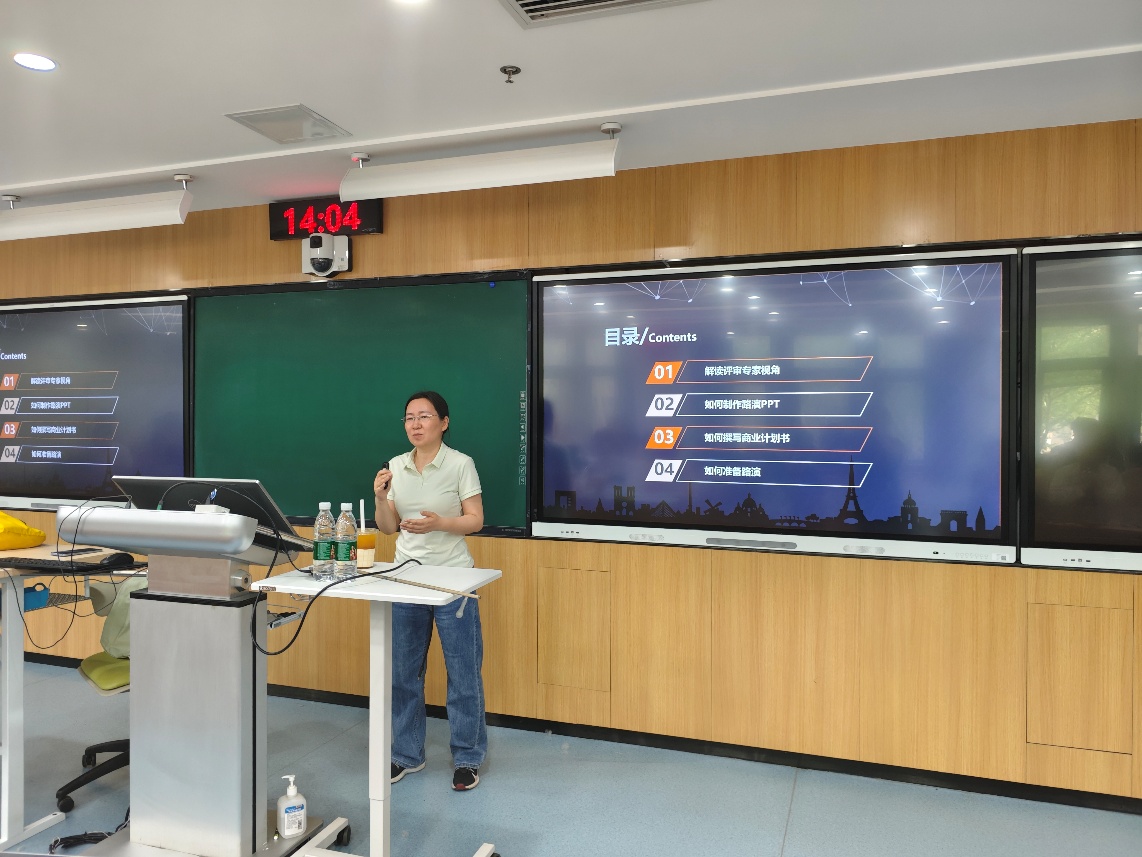 在现场路演准备及发挥方面,韩老师从心理调适、语言表达、时间把控、个人形象及问辩应对等多个维度进行了分享。她鼓励同学们以自信饱满的状态迎接路演挑战,确保在有限的时间内充分展示项目的优势和亮点。