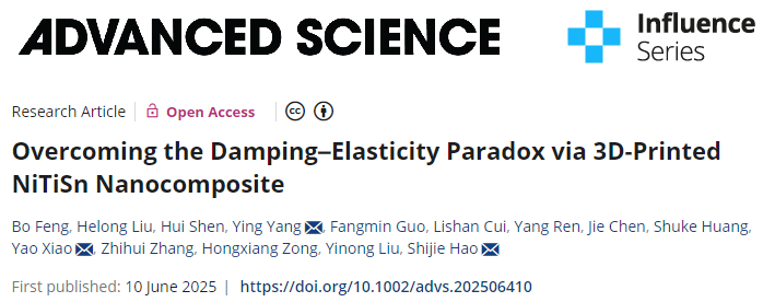 中国石油大学(北京)新能源与材料学院的郝世杰教授研究团队近期在《Advanced Science》期刊上发表了题目为《Overcoming the Damping–Elasticity Paradox via 3D‐Printed NiTiSn Nanocomposite》的研究论文。论文的第一作者为新能源与材料学院的研究生冯博,刘何龙和沈慧研究生为共同一作。