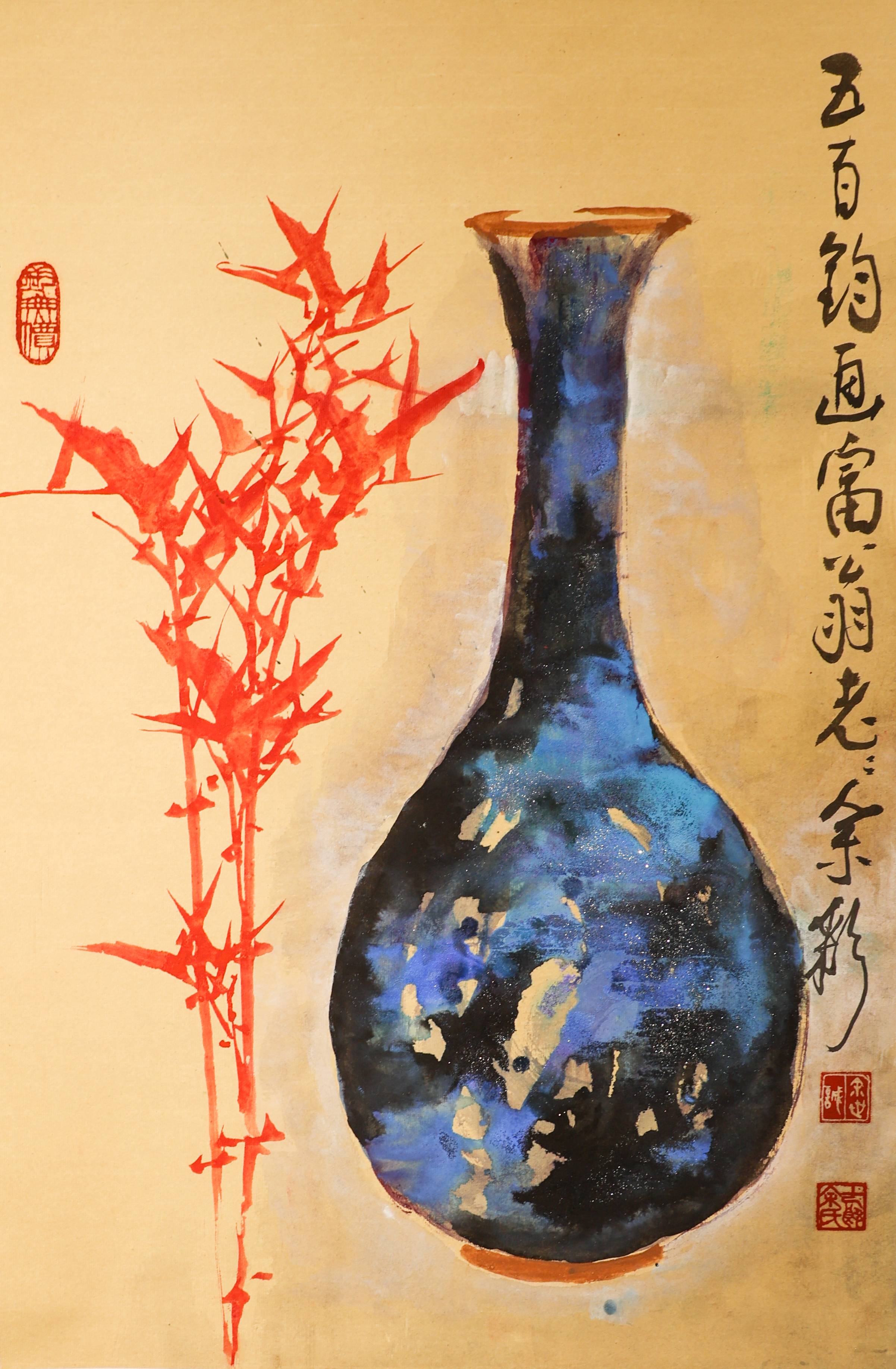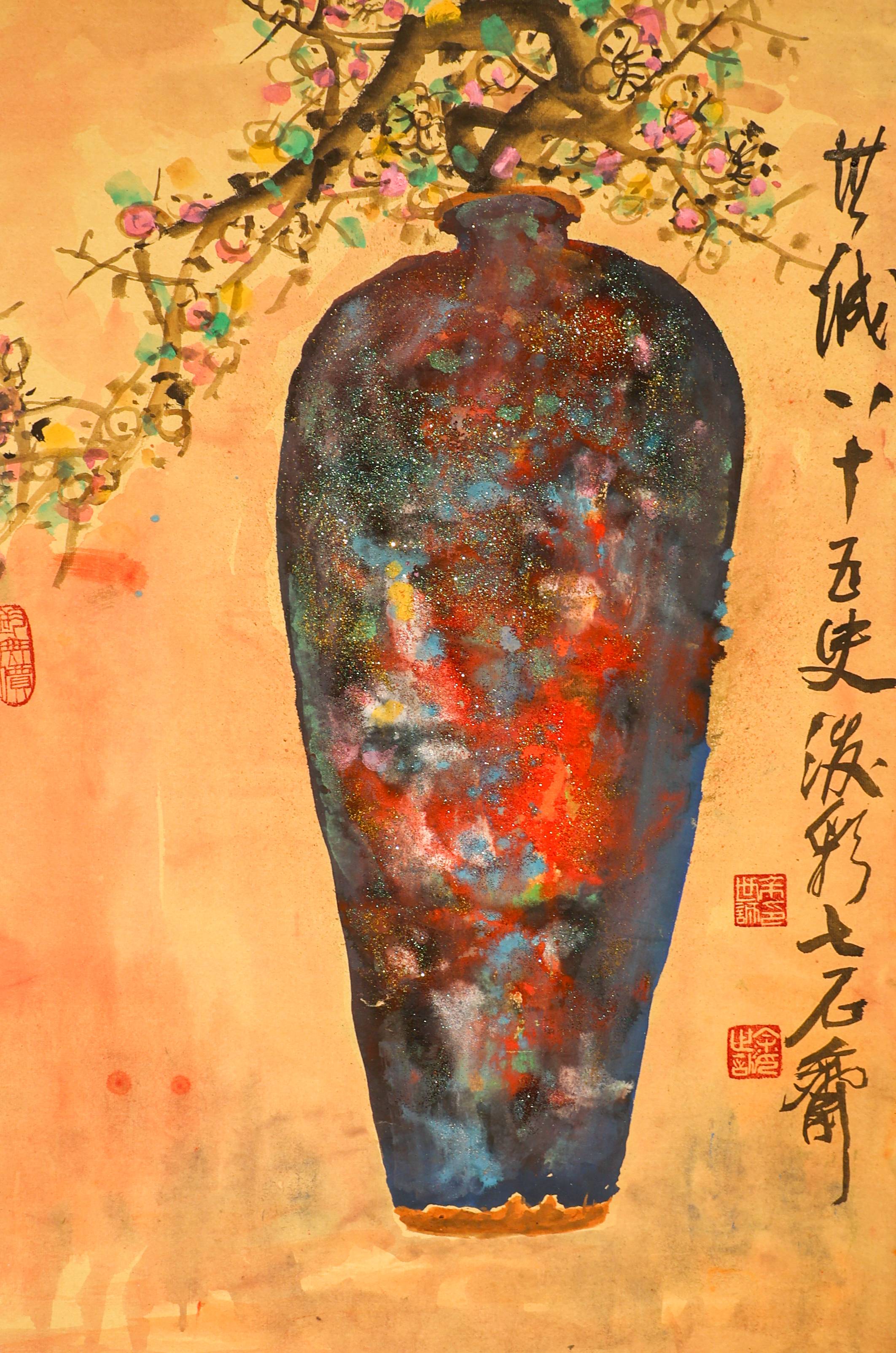 钧瓷是我国宋代五大名瓷之一,以“入窑一色,出炉万彩”为特点,余世诚以钧瓷窑变为创作之源,坚持重彩大写意的创作理念,以国画形式和传统技法来表现钧瓷窑变之美和钧器之美,既开启了中国画的新意境,又增加了钧瓷艺术欣赏和钧瓷文化新内容。