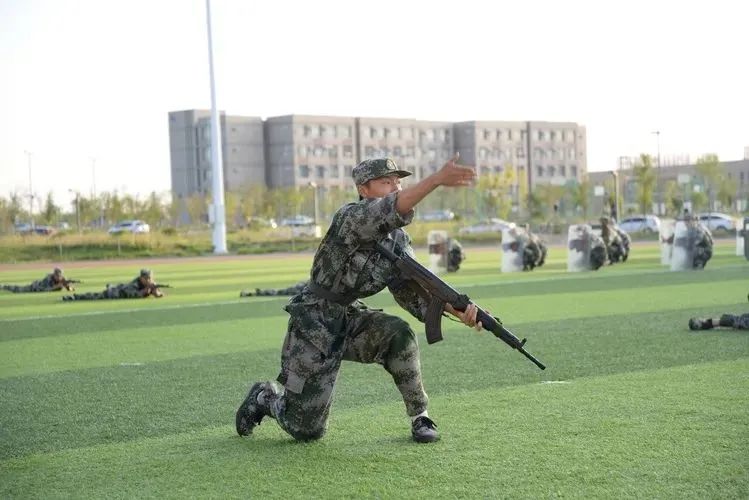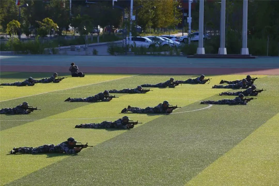 在克拉玛依校区的红旗操场上新生认真参加入学军训