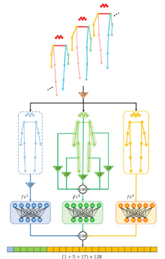 为了增强步态特征的区分性,本文提出了基于人体骨骼图的多尺度级联模块(MSCM)获取多尺度步态表征,分别处理关节尺度、肢体尺度和姿势尺度的判别特征。具体细节如图6所示。