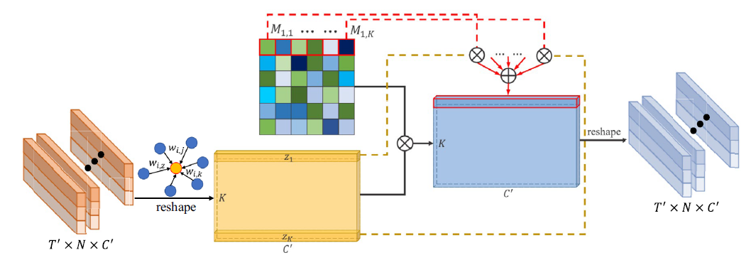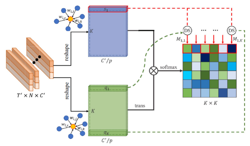为了捕获关节之间的协调关系,我们设计了一个协调特征学习器(CFL ),首先计算关节特征之间的点积相似性,并通过softmax函数将它们映射到区间(0, 1),生成一个协调系数向量,如图4所示。通过连接每个关节的这些向量,得到一个协调系数矩阵。