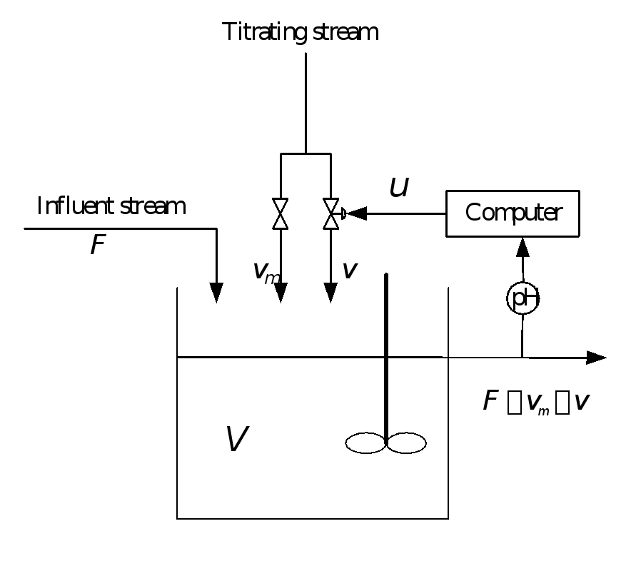 代表容器容积,其中浓度为0.02mol/L的醋酸作为输入流在连续搅拌釜反应器中通过浓度为0.5mol/L氢氧化钠的滴定流进行滴定。滴定流分为