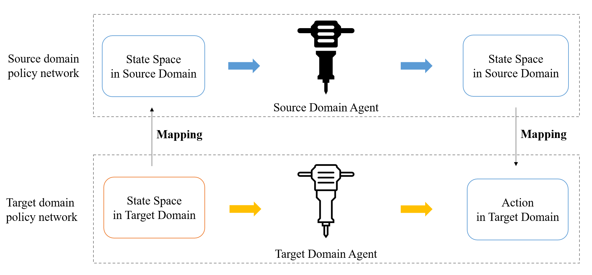,即对于当前状态输出一个确定性动作。从本质而言,策略网络是一个非线性策略逼近器,用于对策略模型π(a|s)进行逼近。因此,对策略网络的迁移实质上是对源领域的状态-动作关系进行迁移。策略网络具体的迁移过程如图4所示。