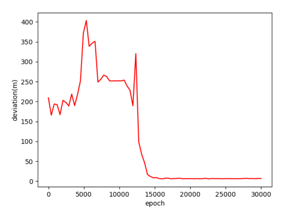 在不确定干扰的约束下,井眼轨迹跟踪控制算法在15000步左右逐渐收敛。收敛后的井眼轨迹跟踪控制算法的井眼轨迹最大偏移距离为3m左右,中靶率约为97%。实验结果表明,基于迁移学习的井眼轨迹自适应跟踪控制算法具备良好的抗干扰能力,能够在干扰约束下完成较高精度的轨迹跟踪任务,成功引导井眼轨迹到达地层中的靶区。