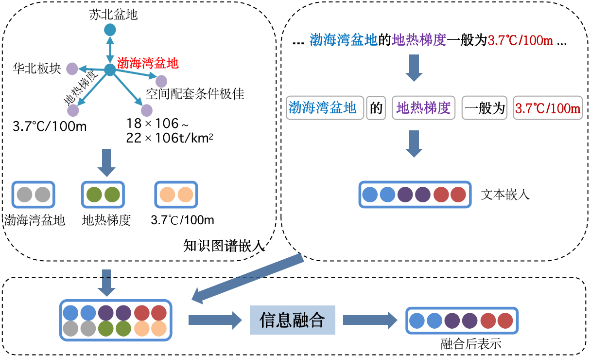 图嵌入如图2所示,将知识图谱中的实体和关系映射到高维向量空间。而知识图谱与文档信息的融合如图3所示。通过将知识图谱中实体“渤海湾盆地”“18×106~22×106t/km2”“3.7℃/100m”等表示与段落表示中的对应词的表示进行融合,增强了段落语义信息。其中,首先分析问句得到含油气盆地知识图谱中的对应子图;然后通过预先训练好的TransE嵌入模型得到问题对应知识图谱中实体的向量表示;最后使用自注意力机制融合编码文本段落信息和实体信息,从而得到更新后的段落表示。