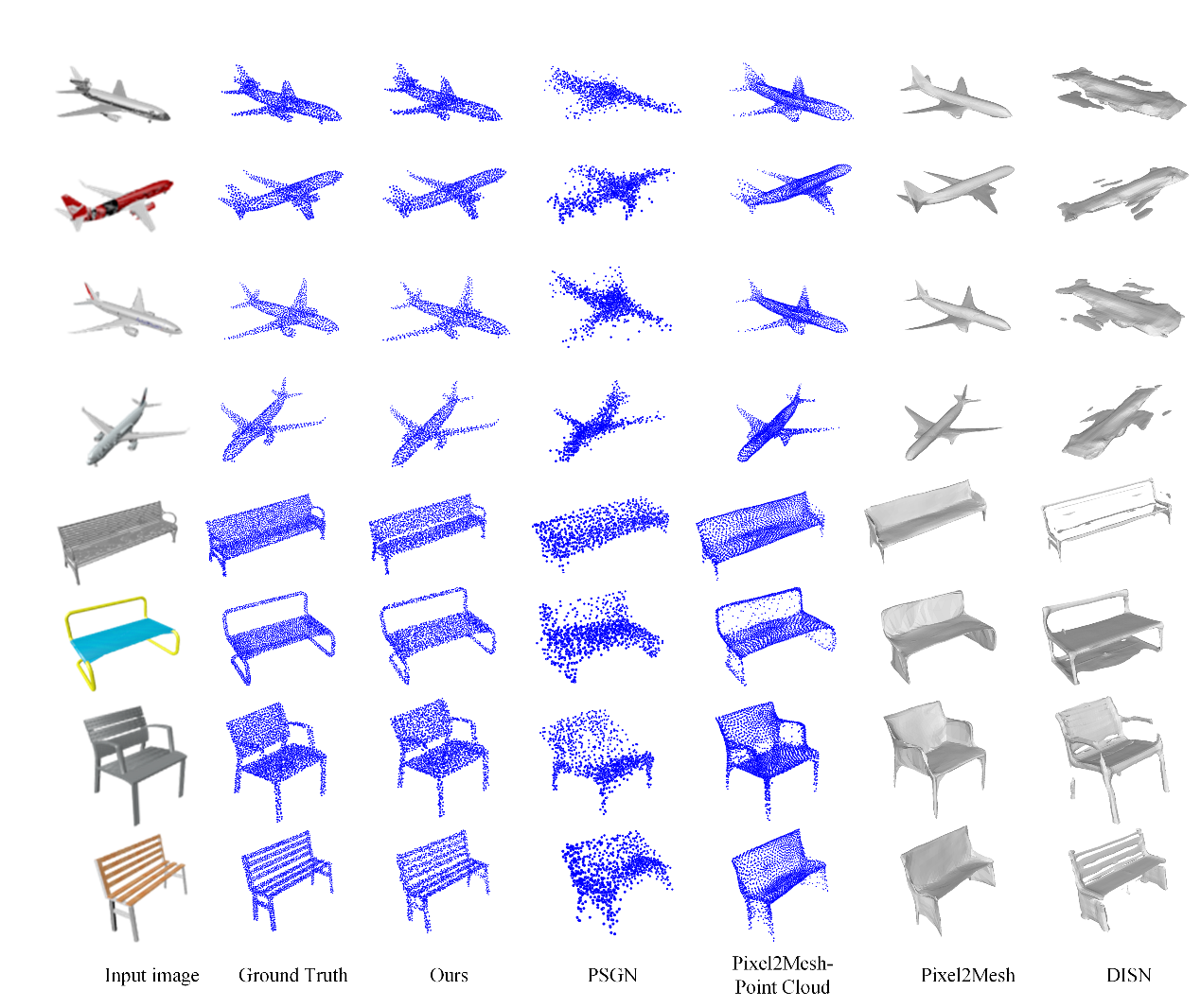 近年来,随着深度学习和图像处理技术的飞速发展,单视图三维模型重建技术得到广泛关注。由于单视图存在自遮挡问题,无法充分表达图像的上下文信息,因此基于点云的单视图三维物体重建极具挑战性。传统的面向点云的单视图三维重建算法根据图像表观特征恢复物体空间结构,对图像的质量要求较高,并且存在时间复杂度高、重建结果不精确等问题。与传统方法相比,基于深度学习的方法能够快速提取输入图像的细节特征并推理空间几何结构,实现高效的三维重建,但仍存在对图像局部信息利用的不够充分导致重建结果不精确的局限性。