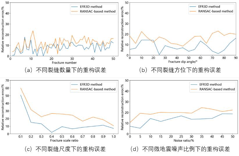 2.在不同裂缝数量、裂缝方向、裂缝尺度和微地震噪声比例的模拟中,相较于RANSAC方法,本文方法具有更高的重构精度和鲁棒性,能够有效减少了内部阈值选取和初始平面选择对裂缝方位检测的影响。