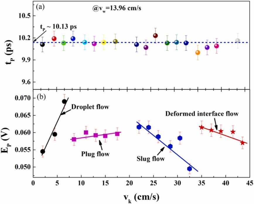 图4和图5为水相表观速度(vw)为13.96 cm/s时,改变煤油的表观速度时在微通道中部采样得到的稳定流动状态的油水两相流的太赫兹时域波形和相关参数。受油相速度的影响,油水两相在微通道内的相分布产生了变化,太赫兹光谱信号参数的上下波动反映了不同的流型转变。