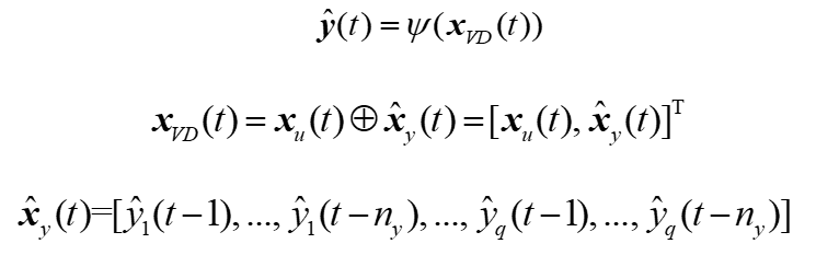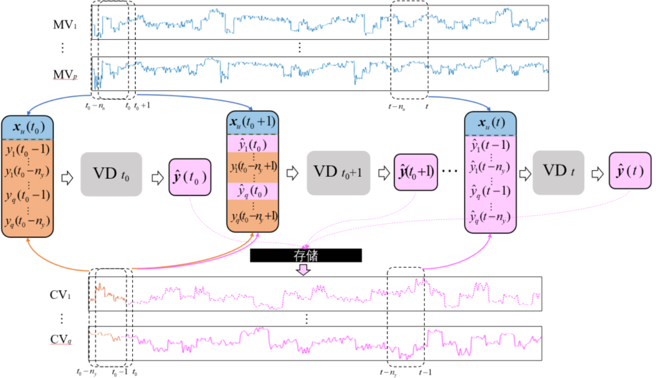 在神经网络训练过程中,模型的输入由实际采样数据组成。这种模型被大多数基于深度学习的非线性系统辨识方法所使用。然而,为了模拟被控对象对控制信号的响应,希望在训练结束后构建一个只使用CV的实际初始条件和MV的实际值作为输入的模型。该模型可以作为虚拟装置模拟受控对象在不同工况下的动态响应或测试控制算法的性能,更适合控制领域。因此,模型的输入向量由实际输入和预测输出组成,而不是实际输入和实际输出,如下式所示。