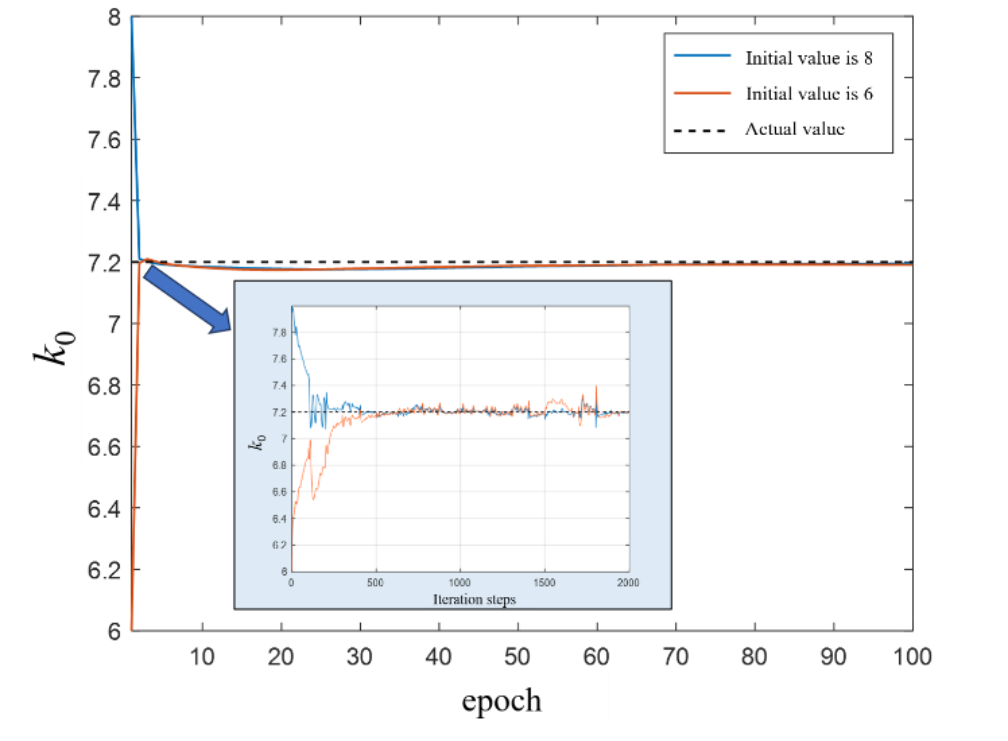 在机理模型的所有参数都是常数的情况下,通过网络反向传播,以计算损失函数对LSTM网络的权重和残差的权重的梯度。如下式所示,所提出的训练方法的基本思想是在具有较大损失的区域中最大化相对于自适应权重的损失,并最小化相对于网络权重的损失。
