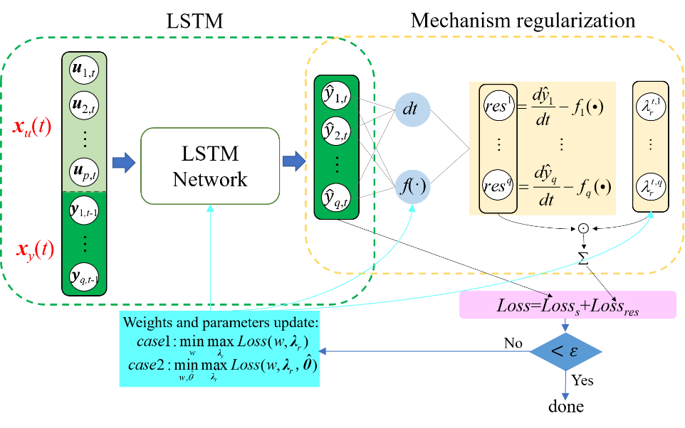 MRLSTM框架由两部分组成。该框架的第一部分是LSTM网络结构。然后,LSTM网络的输出被输入到机理正则化部分,该部分本质上由描述动态过程遵循的q个微分方程组成,以评估微分方程的残差。本研究考虑以下形式的一般非线性常微分方程(Ordinary differential equation,ODE)作为已知机理方程: