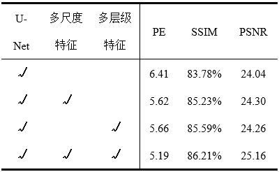 本文分别去除多尺度特征模块与多层级特征模块进行消融实验。通过表2中的客观指标可以看出,去除单个特征模块后各类评价指标均会存在不同程度的降低,验证了本文所提多尺度与多层级特征模块的有效性。