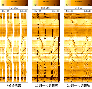 为避免离群值影响,本文调整了输入模型的电阻率数据的归一化方式,调整后空白带填充效果得到极大改善。调整前后填充结果如图9所示。