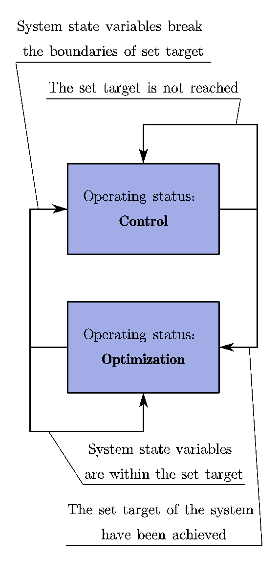 本文以能源与经济优化为目的,提出了一种基于冗余控制变量的优化策略。该策略能够被使用在区间控制的框架下。当系统在设置区域之外时,由区域预测控制器进行控制,以便系统可以快速进入设定目标。当控制器进入设定目标的内部时,意味着控制目标已经实现,产品质量已经满足需求。此时,可以优化系统的经济性能。 尽管经济优化通常与控制性能不兼容,但在区间控制的框架下可以利用其潜在的自由度协调这两种关系。系统的外部干扰等因素可能会打破这种优化与控制共存的状态。在这种情况下,控制策略应当及时切换以免产品质量受到影响。整个系统将处于这种动态平衡过程中。