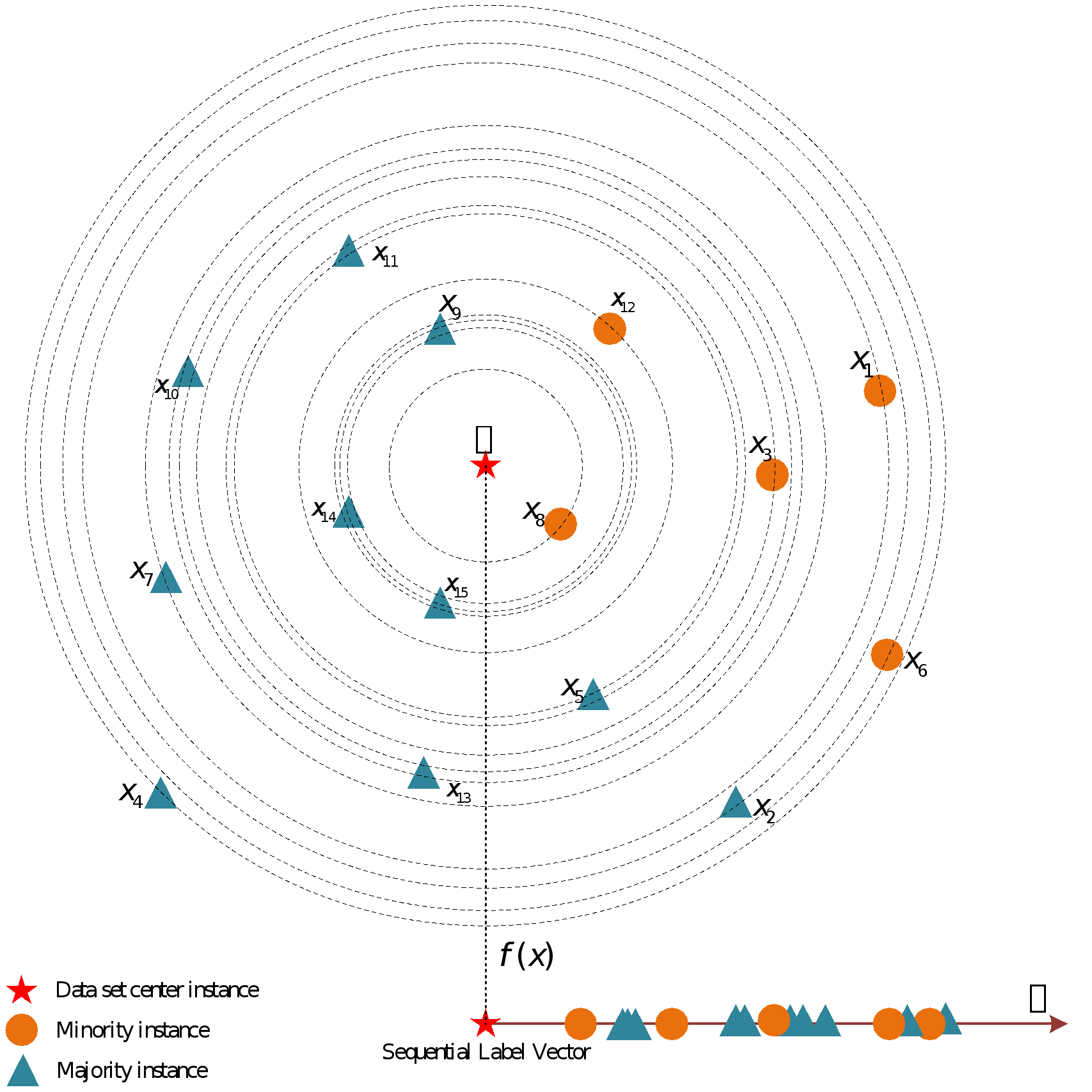第二阶段,根据有序距离向量中样本的原始索引值,记录有序距离向量中样本的标签信息。根据标签索引与有序距离向量对应,获得样本的有序标签向量。然后,根据有序标签向量计算数据集中每个类的样本的映射割点数。