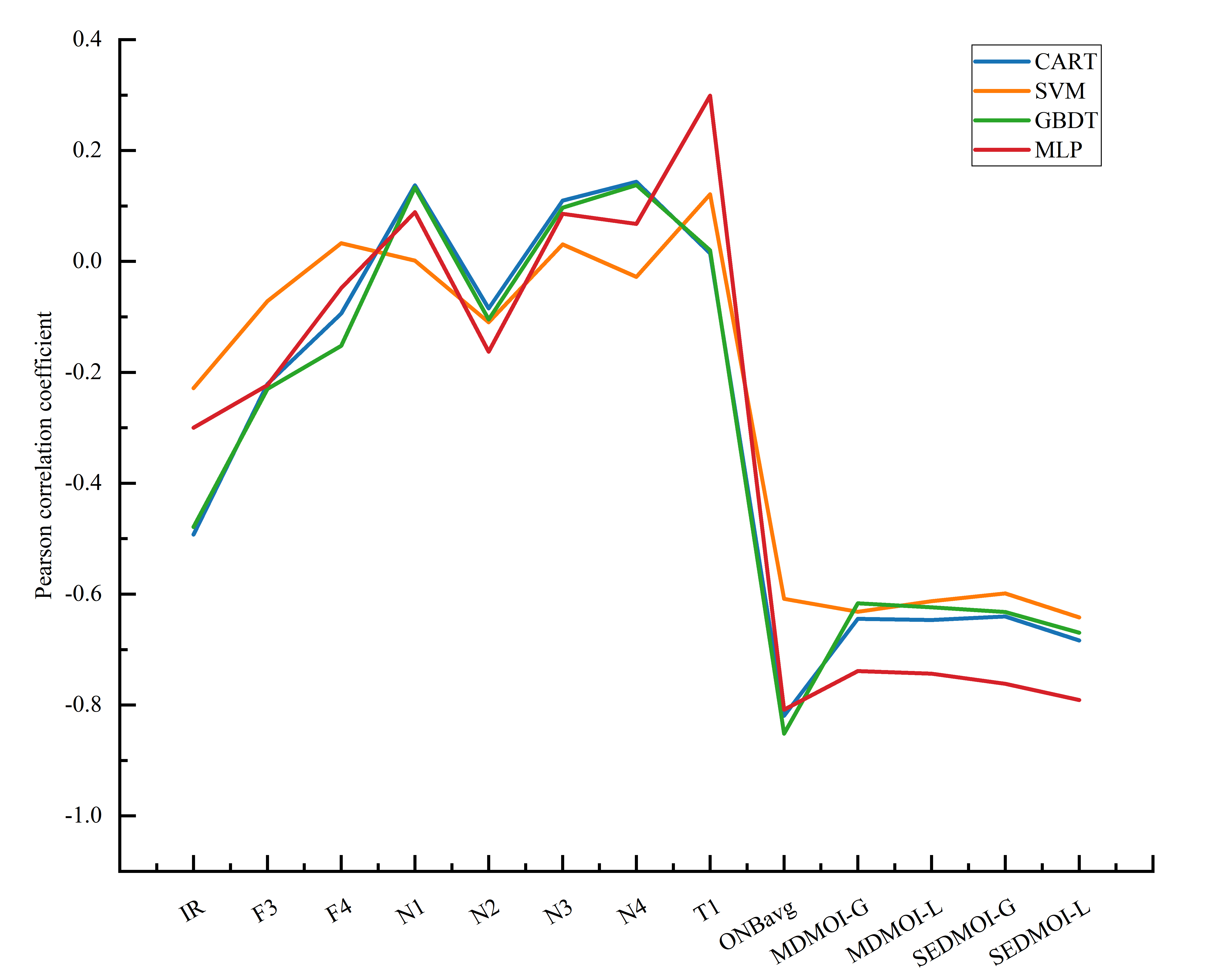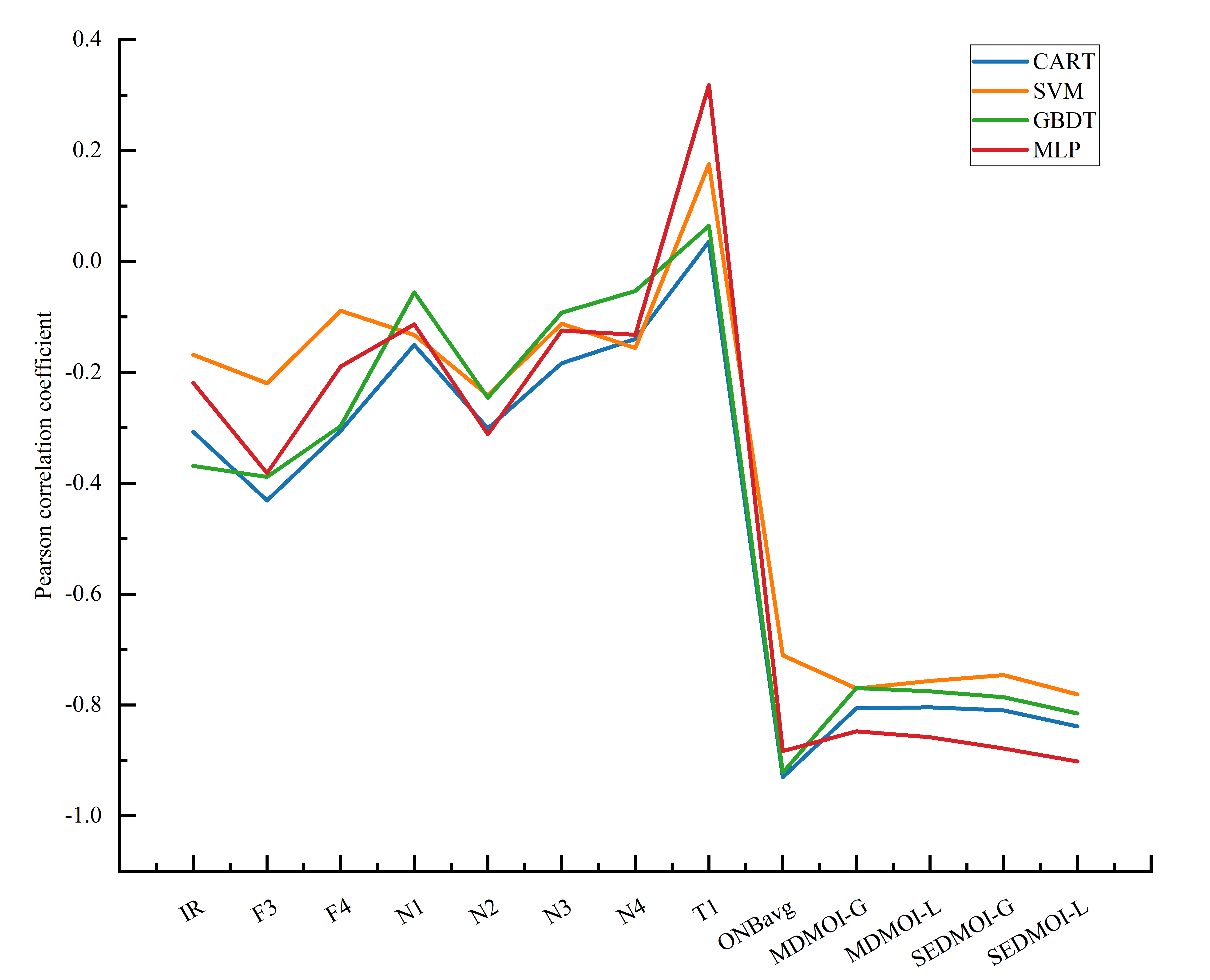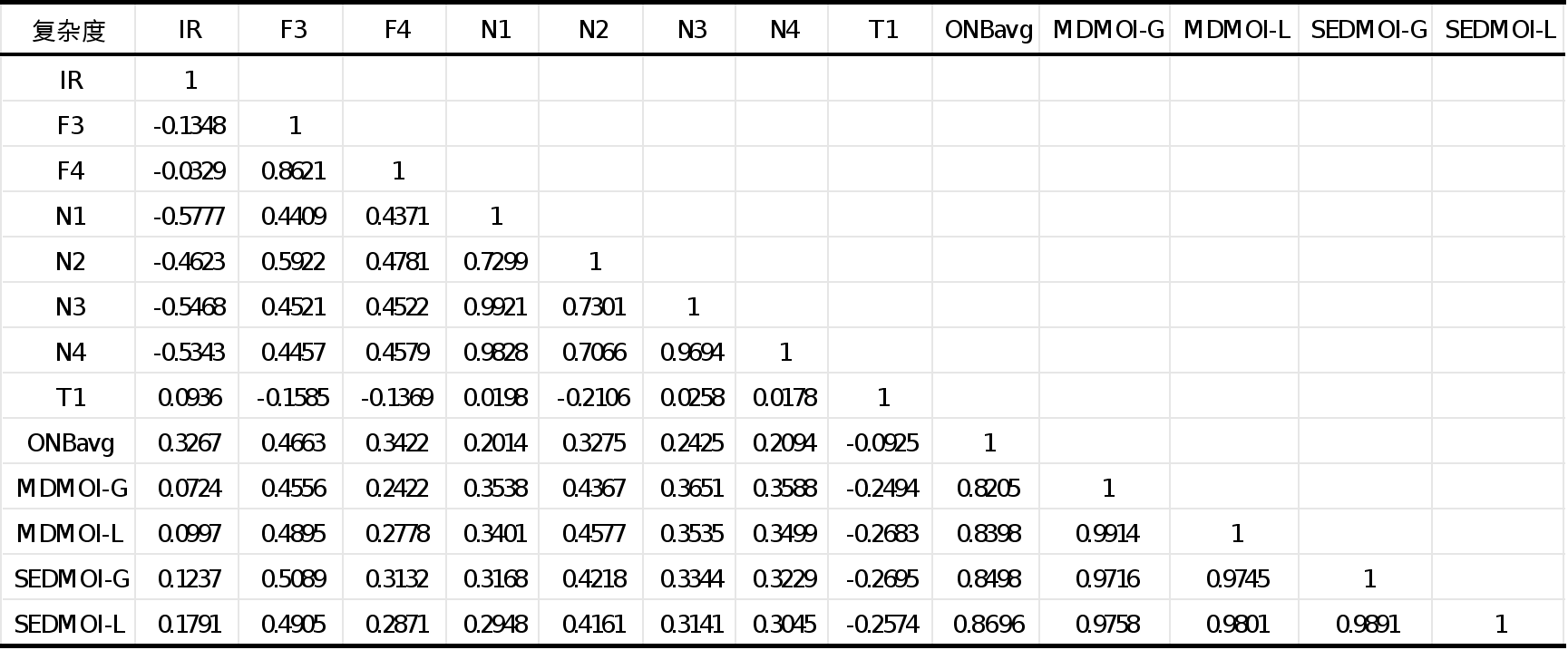 在50个不平衡数据集上进行对比实验,并计算分类结果与复杂度度量方法之间的皮尔逊相关系数,实验结果如下所示。