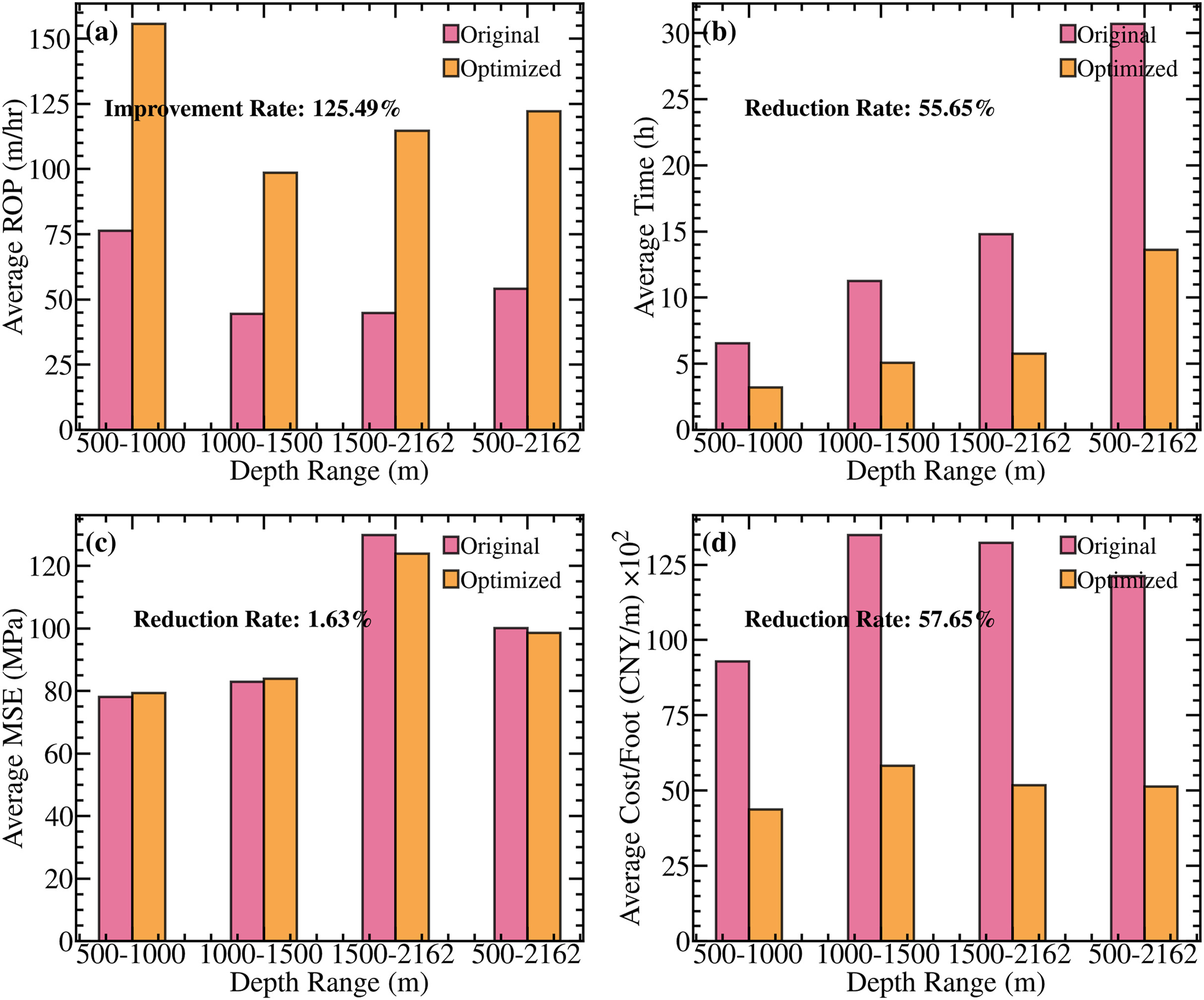 本文提出了一个多目标钻井参数优化框架,结合符号回归、时间序列网络和马尔可夫决策过程,以精确预测钻进速度、地层条件,并实时优化钻井参数。包括用于构建经验方程的多群体进化符号回归算法、用于数据预处理的变分模态分解和样本熵的集成,以及用于提高预测准确性的多头自注意力时间序列网络。分位数回归进一步估计钻取参数调整的范围。此外,还开发了一种钻井参数优化深度确定性策略梯度算法来自动进行实时参数调整。对南海乐东10-1 区块的实证分析表明,钻井速度显著改善:ROP 从 54.18 m/hr 增加到 122.17 m/hr,机械比能从 100.82 MPa 下降到 97.78 MPa,每英尺成本从 121.16 × 102 CNY /m 降低到 51.31 × 102 CNY/m。