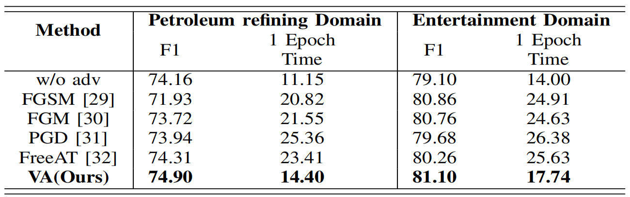 在对抗训练层面上,我们基于未增强的数据比较各种基线的对抗训练方式如表3,发现虚拟对抗在石油炼化领域和娱乐领域,它的F1值相比于性能最佳的对抗方式有着0.59和0.24的提升,这证明了虚拟对抗的有效性。