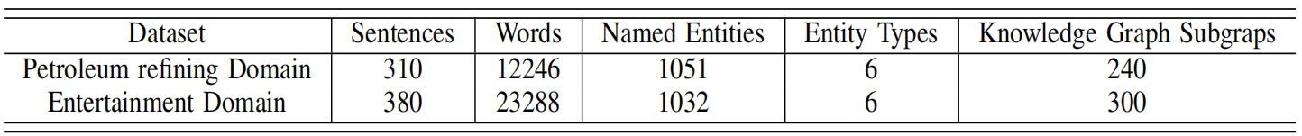 由于现存的CNER公共数据集中基本都是通用领域的数据集,而一些专业领域的数据集例如中文医学领域数据集中又没有对应的由结构化和半结构化的信息中提取实体关系从而构建的知识图谱。因此,为了落实实际应用以及检验我们方法的有效性,我们提出了石油炼化领域的标注数据集以及该领域从结构化和半结构化的信息中提取实体关系构建出来的知识图谱。同时为了验证模型的泛化性,我们对中文关系抽取数据集DuIE2.0进行筛选,将其中的实体类别进行细粒度划分,最后形成娱乐领域标注数据集,并模拟了娱乐领域只含有图信息的知识图谱。两个数据集的详细信息如表1所示。