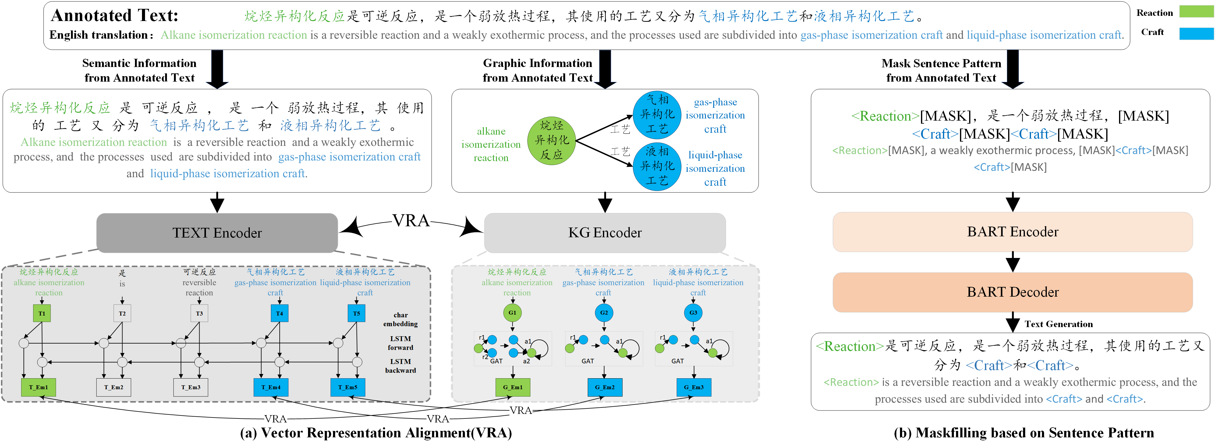 图1展示了KGTA-BART数据增强方法模型训练的结构。图1的(a)部分展示了向量表示对齐模块。由于已标注文本中不仅包含了语义维度信息,同时可提取出图维度信息。我们提出通过文本编码器和图编码器可以分别获取到文本维度和图维度实体向量。为了弥合文本维度和图维度间的差距,我们通过使用欧几里德距离来模拟向量表示对齐。向量表示对齐能够有效地将已标注文本中的文本信息和图信息对齐。其为后续知识图谱与文本对齐提供有力的帮助。