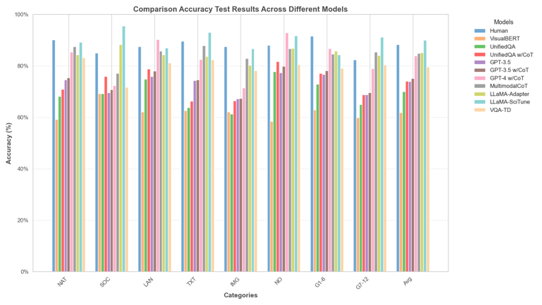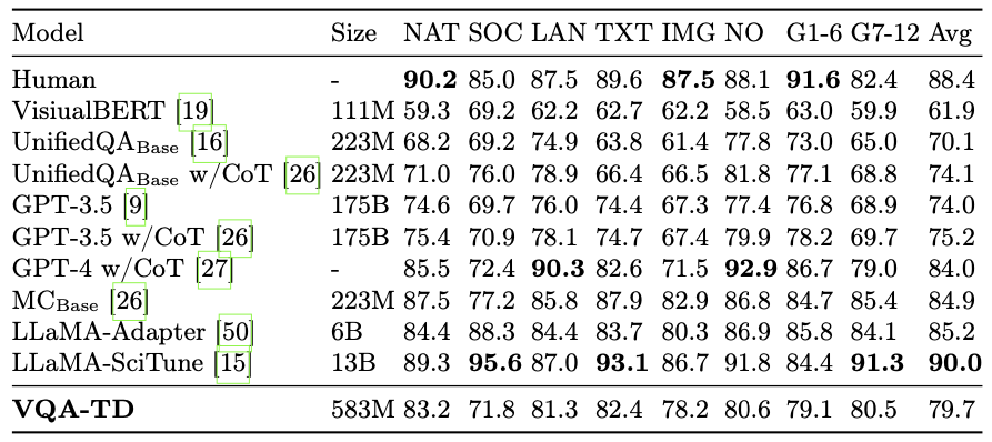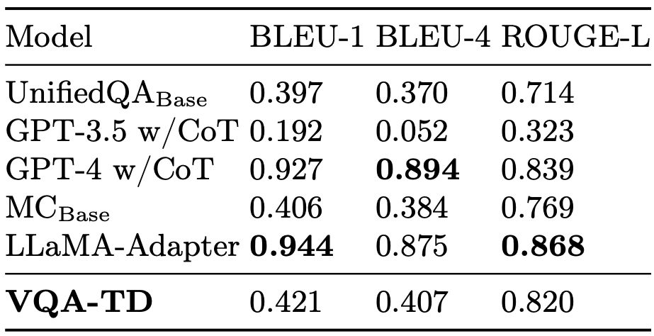 在ScienceQA数据集上的对比实验表明,VQA-TD以GPT-3.5的1%参数量,在答案准确率和解释文本生成质量上超过GPT-3.5;在部分任务上接近或超越Llama以及GPT-4。