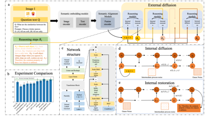 本文提出了一种新的VQA算法框架——扩散思维链模型(VQA-TD)。我们通过构建扩散思维链模型,实现了从问题到答案的逐步推理过程。该模型由内外部两个扩散过程组成,即通过外部扩散捕获推理步骤之间的联系;通过内部扩散生成每一推理步骤的解释。实验结果表明,即使是在模型较小的情况下,VQA-TD仍能有效缓解复杂问题中的语义偏移问题,提升了答案预测精度,并能够生成质量更好的解释文本。