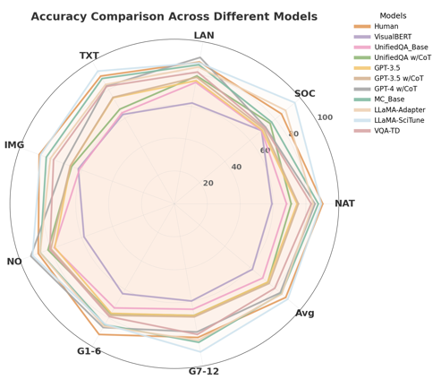 表1 对比试验结果(NAT:自然科学;SOC:社会科学;LAN:语言科学;TXT:文本提示;IMG:图像提示;NO:无提示;G1-6:1-6年级题目;G7-12:7-12年级题目)