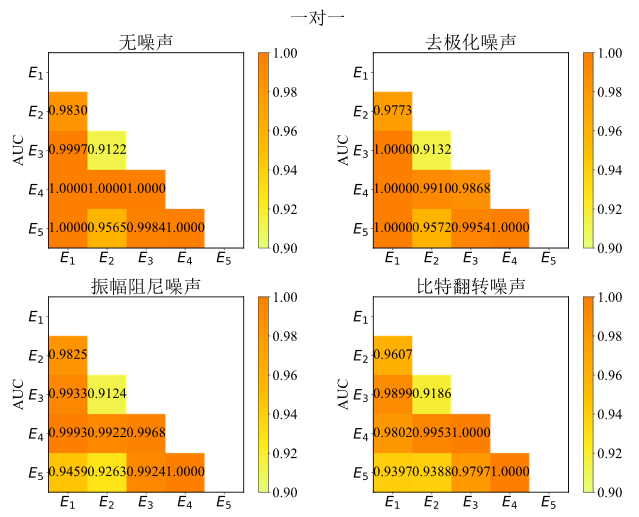 针对一对一和一对多模型的数值模拟实验结果呈现在图3和图4中。对于一对一模型,在许多情况下,AUC大于0.95,有些情况甚至达到了1.0,表明方法有着极高的分类性能。对于一对多模型,与一对一模型相比,准确度略有下降,可能是因为考虑了更多的分类。然而,分类准确度仍然相当可观。