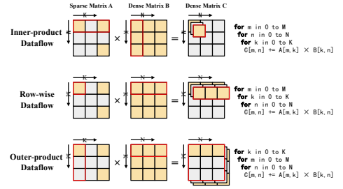 我们以16×16固定分区大小的稀疏块作为外积数据流的基本单元。由于中间积规模较小,片上缓冲区可完全容纳,既避免了大量片外流量,又提高了输入矩阵的重用性。