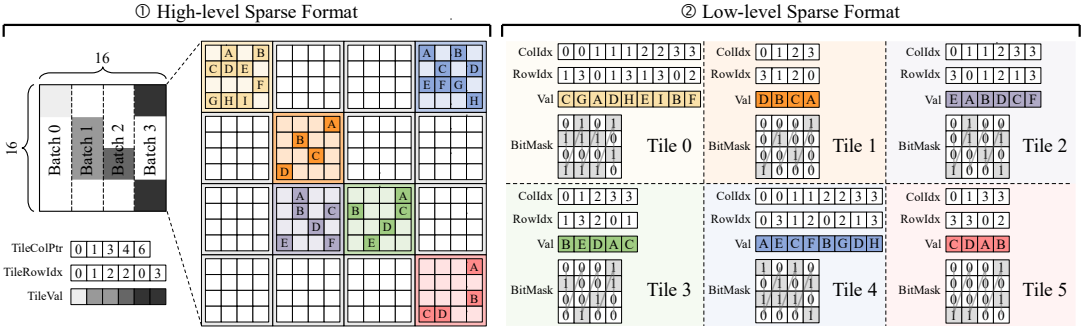 我们使用稀疏块作为基本单位,确保PE间相对负载平衡;为了利用输入稠密矩阵的重用性,我们用CSC格式来存储稀疏块;为了减少额外控制开销,我们利用列主序COO格式存储每个稀疏块中的非零元信息;设置16位无符号掩码数组,存储非零元位置信息。