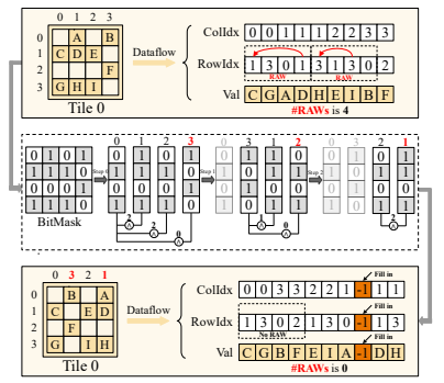 我们提出了一种最小相似度重排算法。该算法利用掩码数组计算稀疏块中列间相似度,进而以列为单位进行非零元重排,同时结合插值操作,有效消除原始数据流中的RAW依赖。