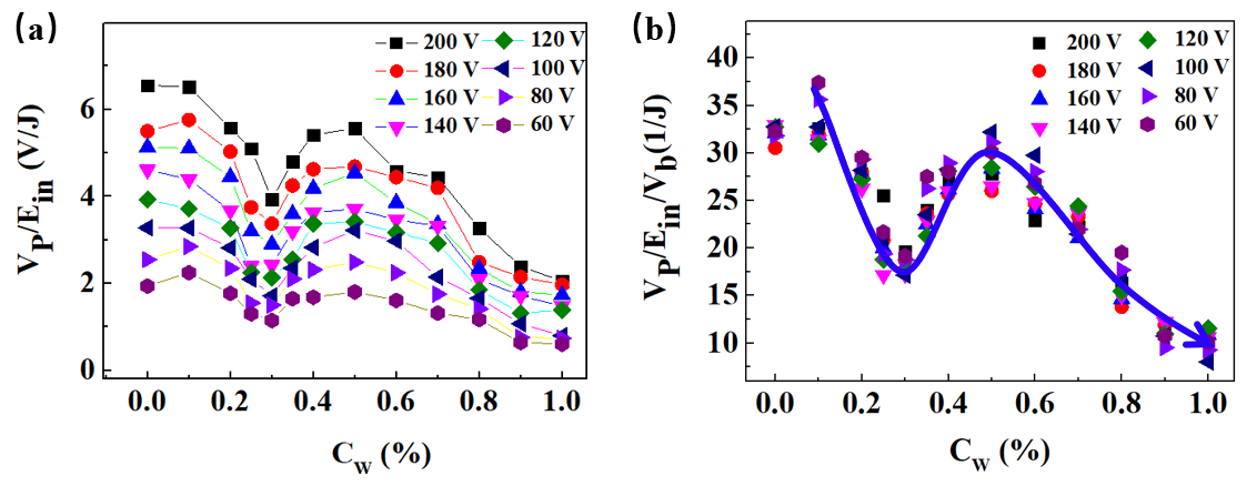 图3 VP/Ein(a)以及VP/Ein/Vb(b)随原油含水率CW的变化。