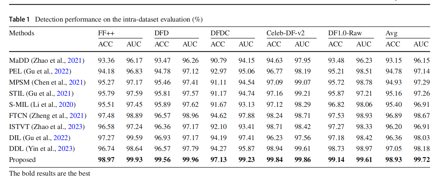 我们准备了6个伪造人脸视频数据集,对于单数据库内的检测,我们的方法基本可以达到97%以上的准确率,如下图。