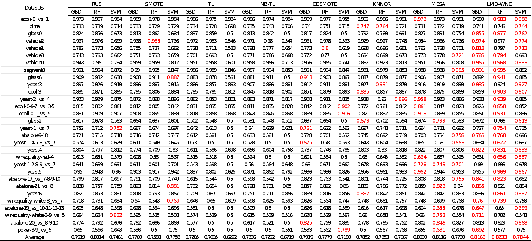 表2 使用G-mean评估模型时的性能结果