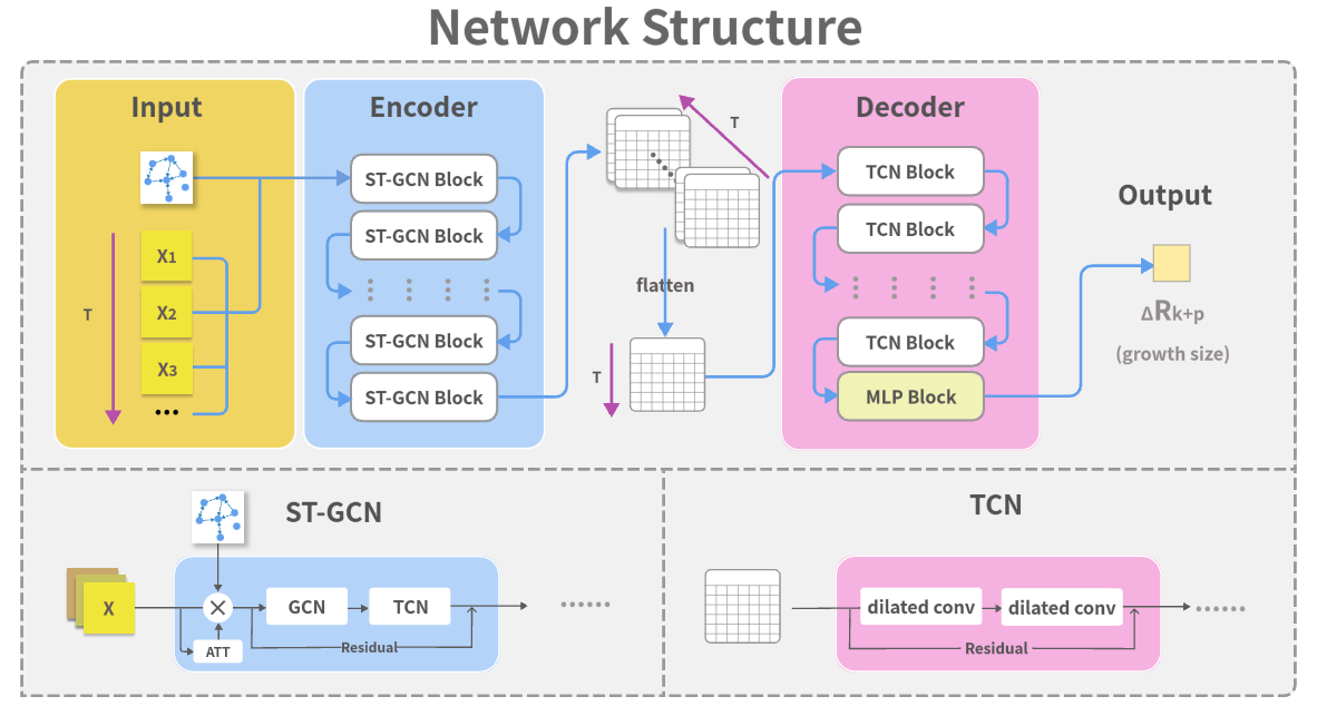 在本文中,受先前研究的启发,我们构建了一种用于级联序列预测的 ST-GCN,我们称之为 CaSTGCN。具体来说,我们使用 ST-GCN 和 TCN,它结合了结构和时间特征来预测给定级联的增长大小。通过定义活动和非活动状态,我们将级联分为多个快照,每个快照都包含底层网络和每个节点的活动状态。这些快照中节点的表示是使用专门设计的 ST-GCN。嵌入结构和时间信息的快照序列发送到 TCN 层以进一步提取时间特征并使用 MLP 层获得最终预测。
