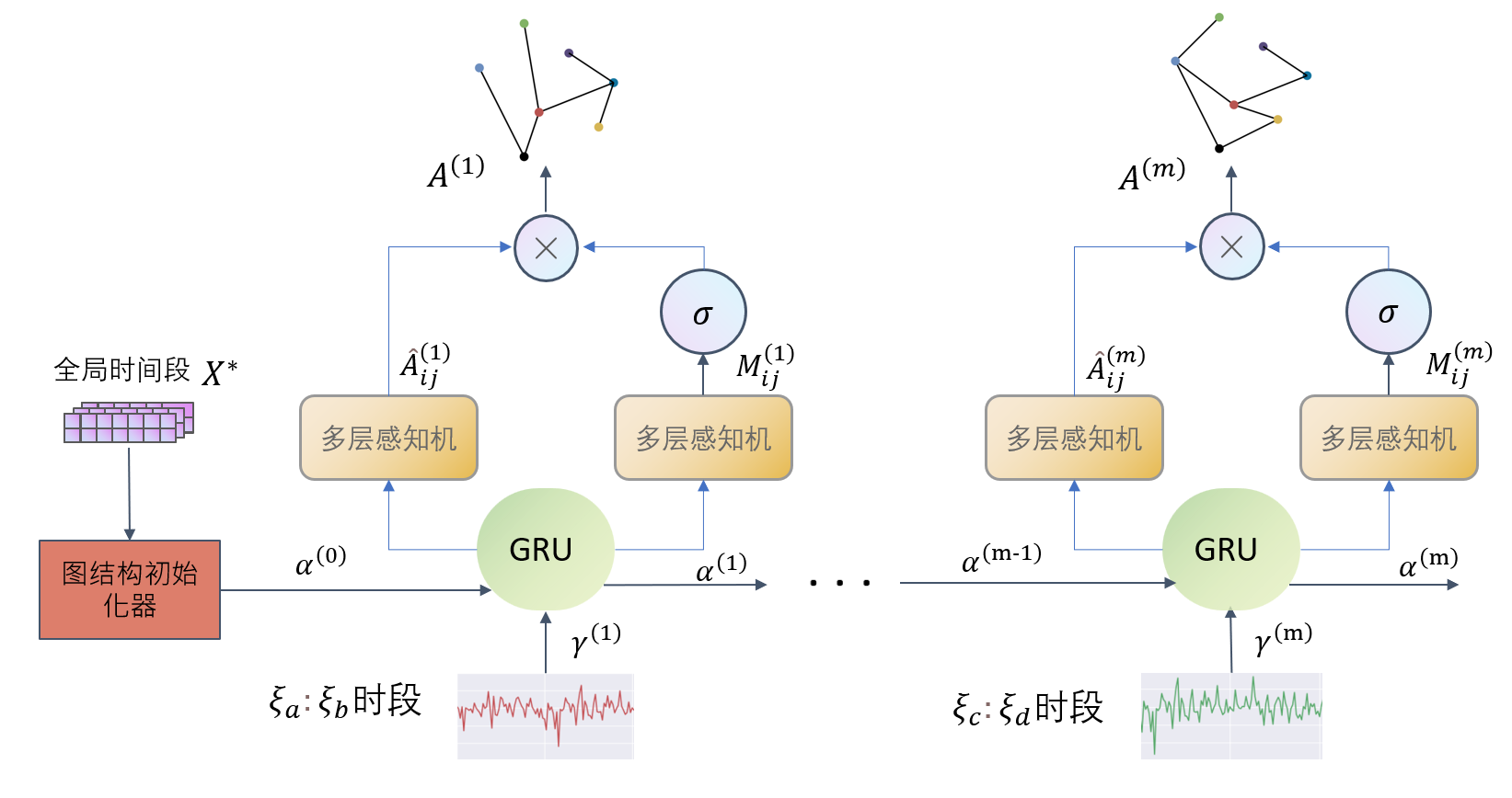 EGL是一种进化的图结构学习器,如图3所示。它以递归方式构造一系列邻接矩阵,提取变量之间的动态相关性,实现更精确地捕获数据中隐藏的空间依赖确立更准确的图结构。