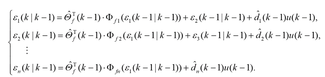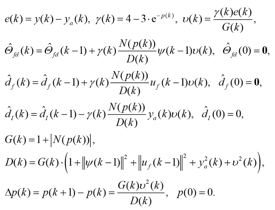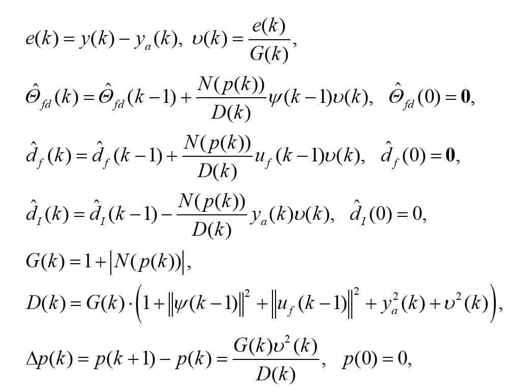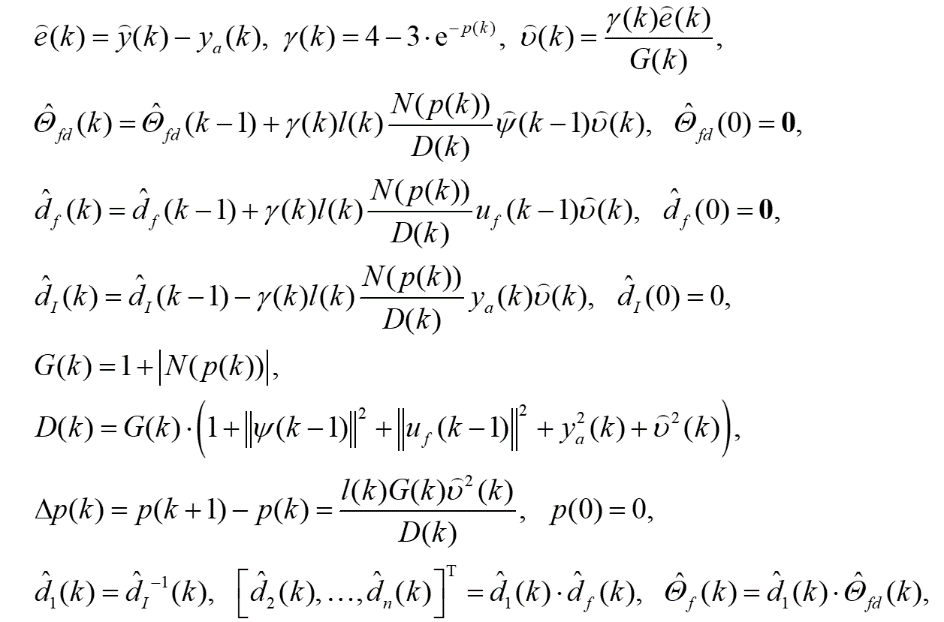 必须修改递归参数更新律(6)。使用参考文献中的死区方法,使用项l(k)来设置更新过程的阈值。因此,利用滤波后的输出,参数更新规律如下: