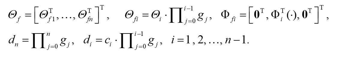 ,考虑自适应控制方案。在不存在输入噪声和输出噪声的情况下,将式(2)中的所有方程迭代代入合并,可以得到如下系统方程: