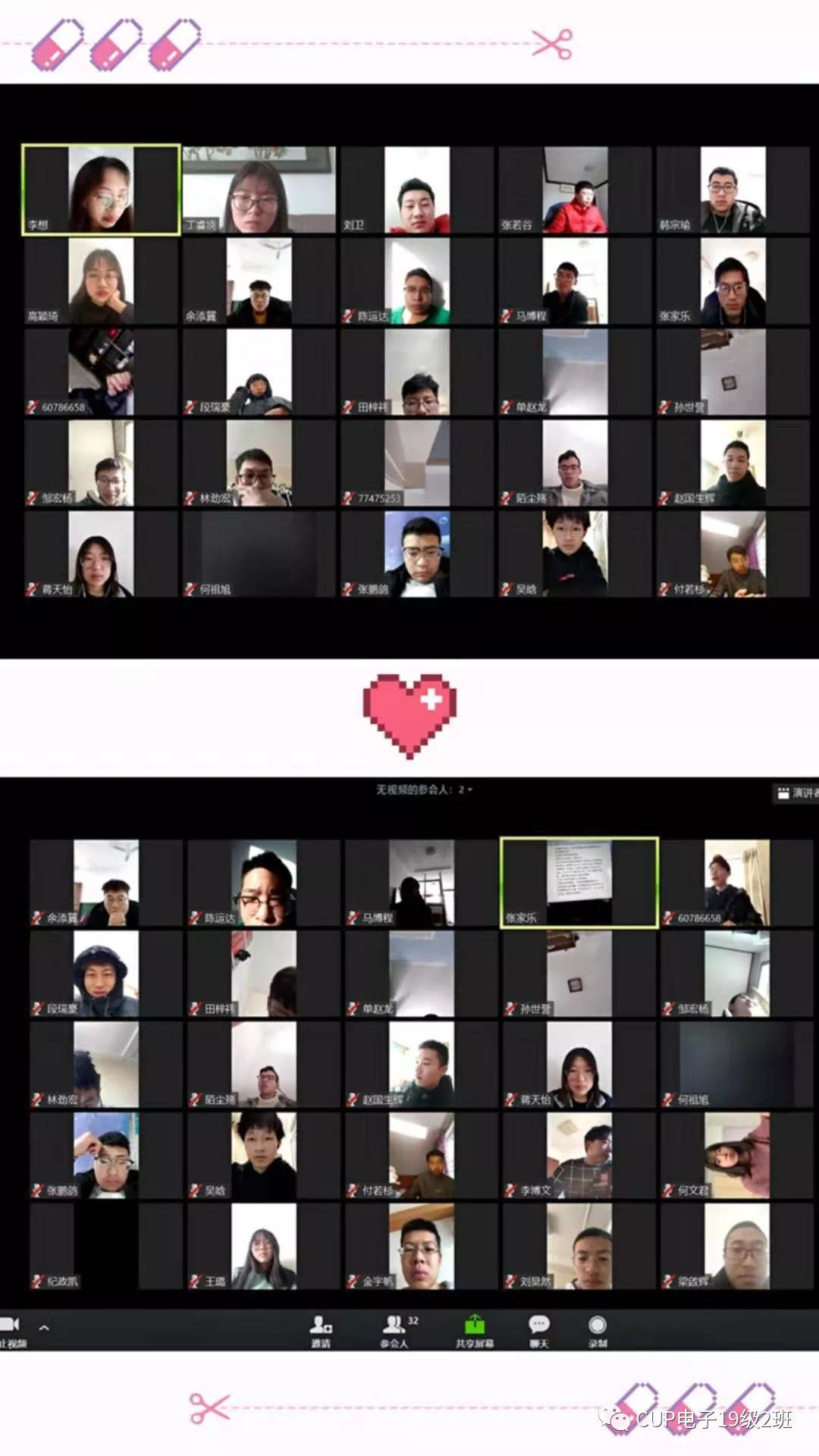 各学生班级和党团支部也自发开展多种疫情防控的活动。自动化18-2班在班级微信公众号建立防疫有我专栏宣传防疫新闻,普及防疫知识;自动化18-3班开展“电子签名承诺书”活动;自动化17-1团支部通过录制宣传倡议视频增强学生防疫意识,为武汉及全国的防疫工作者加油;计算机18-5班成立学习、疫情知识和健康运动小组,通过打卡活动倡导学生们在家中健康生活,努力学习。电子19-班团支部在线召开“小屏幕、心连心”主题团日,给同学们普及疫情防控知识。