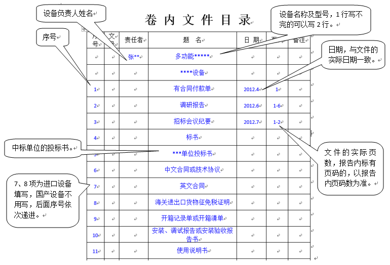仪器设备档案卷内目录和备考表填写示例