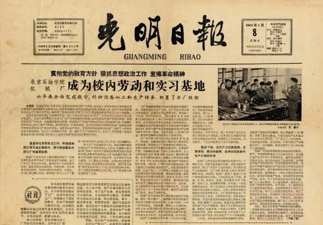 1964年,《光明日报》的头版头条对北京石油学院机械厂的做法进行报道
